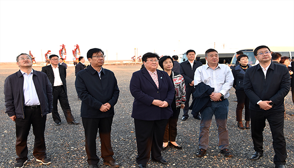 上海寶山區(qū)汪泓書記(中)、海隆集團(tuán)CEO汪濤等在新疆克拉瑪依市委書記趙文泉(左二)、市長王剛(左一)、市委副書記袁罡(右一)陪同下參觀克拉瑪依紅山油田現(xiàn)場
